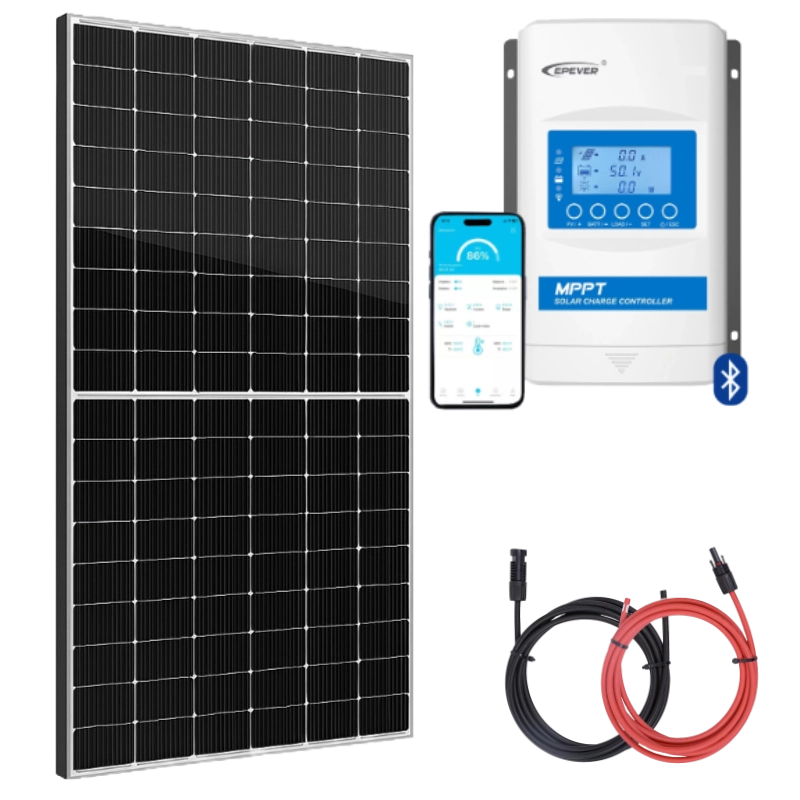 Zestaw zaprojektowano z myślą o łatwości montażu – dołączone okablowanie i złącza MC4 pozwalają na szybkie, intuicyjne i bezpieczne połączenie wszystkich elementów, bez potrzeby specjalistycznej wiedzy technicznej. Dzięki fabrycznie zaciśniętym konektorom montaż ogranicza się do prostego „kliknięcia” wtyczek i przykręcenia przewodów do klem akumulatora. Nie ma potrzeby lutowania, cięcia kabli ani znajomości instalacji elektrycznych